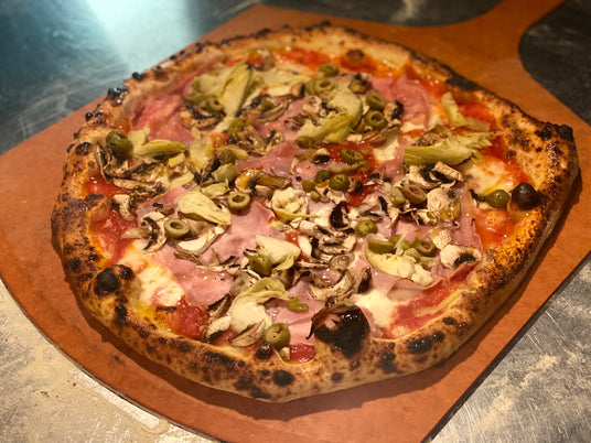 Tomato Sauce, Fior di Latte, Prosciutto Cotto, Artichokes, Olives e Funghi