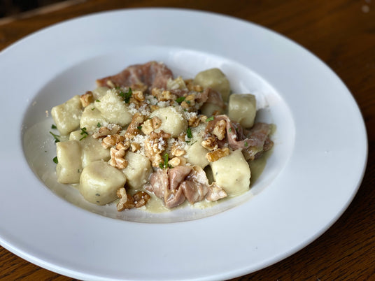 Cremosa Gorgonzola Sauce, Potato Gnocchi, Prosciutto e Walnut Sprinkle