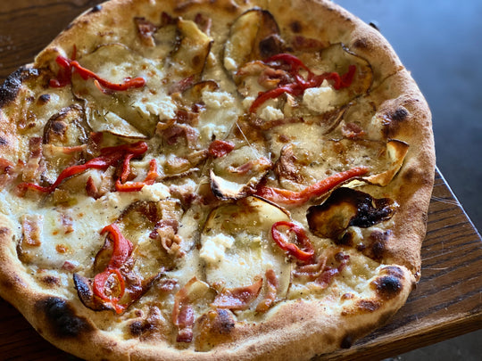#PizzaChallengeYVR 3rd Place - A Fontina Cream Sauce Topped w. Thinly Shaved Potatoes, Rosemary, Fire-Roasted Red Peppers, Fontina, Garlic Confit, Bonetti’s Pancetta, e Giulia’s Fresh Handmade Cheese